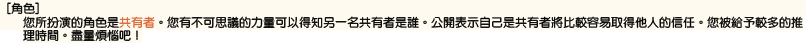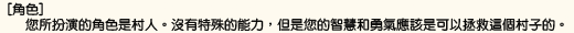 <參加遊戲時必須注意的事情> 「關於遊戲中的內容請不要在遊戲以外的場合進行討論。」 如果這樣做的話遊戲將會變得沒有意思了。 特別是當自己死亡之後把其他人的角色公開出來,請絕對不要有這種行為。 |