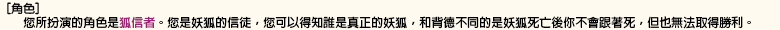 [勝利條件] ・村民的勝利 將人狼、妖狐和子狐全滅 ・人狼的勝利 殺死妖狐和子狐,並使村民的人數和人狼的人數相同或是更少。 ・妖狐的勝利 人狼全滅的時候、以及村民的人數和人狼的人數相同或是更少的時候,若妖狐或子狐存活就算勝利。 您是否存活下來並不是您玩這個遊戲的目的。 就算自己犧牲了,您的隊伍勝利的話則您也屬於勝利者。 | |||||||||||||||||||||||||||||||||||||||||||||||||||||||||||||||||||||||||||||||||||||||||||||||||||||||||||||||||||||||||||||||||||||||||||||||||||||||||||||||||||||||||||||||||||||||||||||||||||||||||||||||||||||||||||||||||||||||||||||||||||||||||||||||||||||