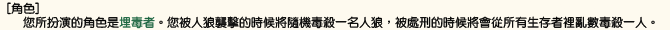 [村民的人口分配] 村子裡面有著特殊的能力者和思想異常的人存在。 以下就是村子的人口分配表。 ・希望村民勝利的人們 村民、占卜師、靈能者、獵人、共有者、貓又 ・希望人狼勝利的人們 人狼、狂人、小企鵝 ・希望妖狐勝利的人們 妖狐、背德、子狐、狐信者、小企鵝
